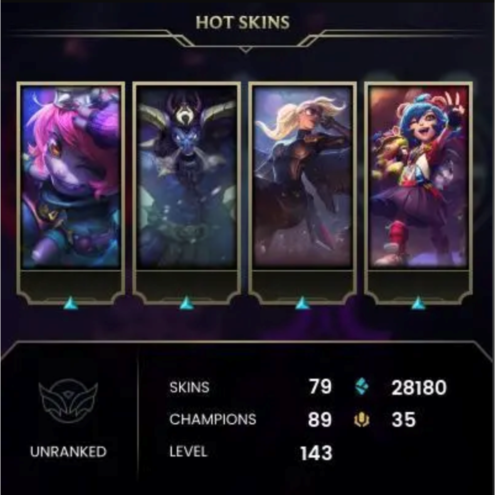 💎 Поднимите свой игровой опыт на новый уровень с этим премиальным аккаунтом League of Legends, включающим 143-й уровень и статус «Без рейтинга». Он включает 89 чемпионов, 28 180 единиц синей эссенции, 35 очков Riot Points и 5 редких обликов. Получите полный доступ к аккаунту Riot Games и привязанной к нему электронной почте, а также возможность привязать свой адрес электронной почты и номер телефона для персонализации.