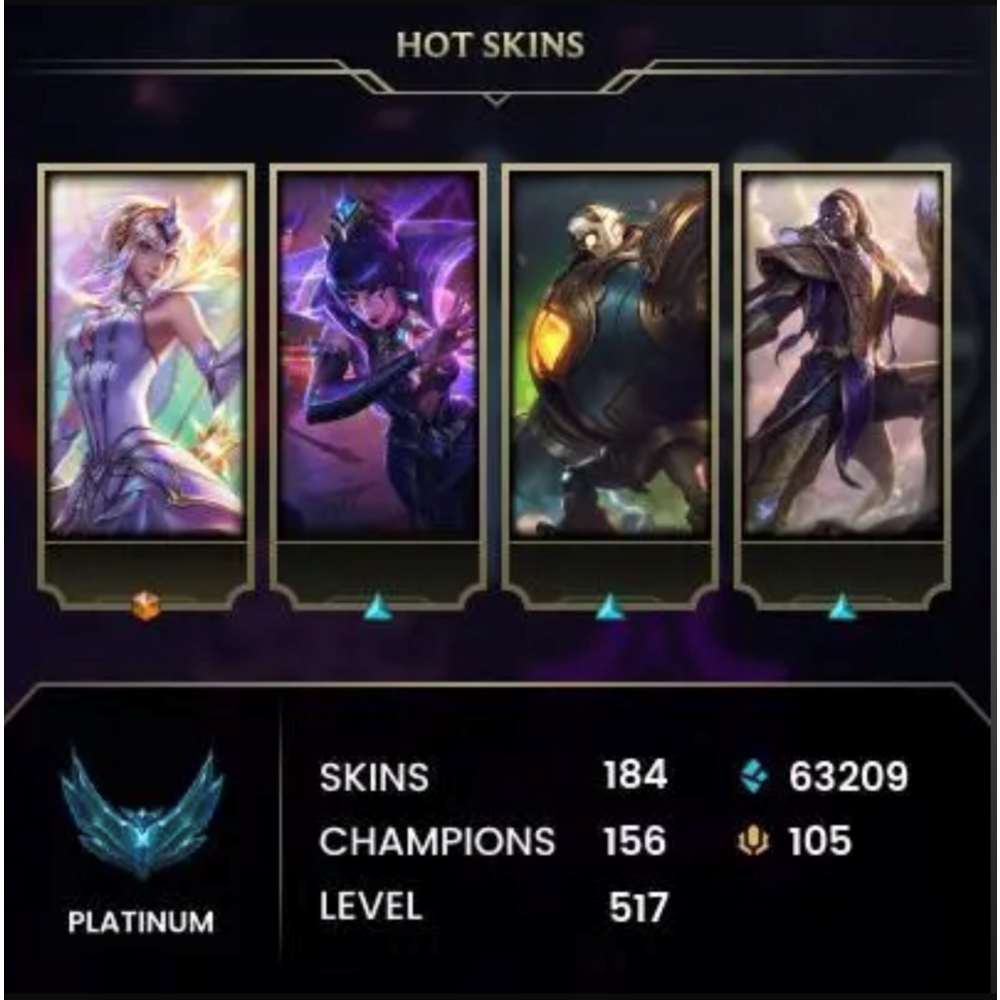 💎 После покупки вы получите премиум-аккаунт League of Legends 517-го уровня с рангом «Платина III», 156 чемпионами и 63 209 единицами Синей эссенции. В него входят 8 редких обликов. Кроме того, вы получите аккаунт Valorant с 2 обликами, 92-м уровнем и 390 RP, доступными по одной электронной почте. Мы предоставим вам полные данные учётной записи Riot Games, а также учётные данные для соответствующей электронной почты, что позволит вам привязать свою электронную почту и свободно обновлять данные и настройки учётной записи.