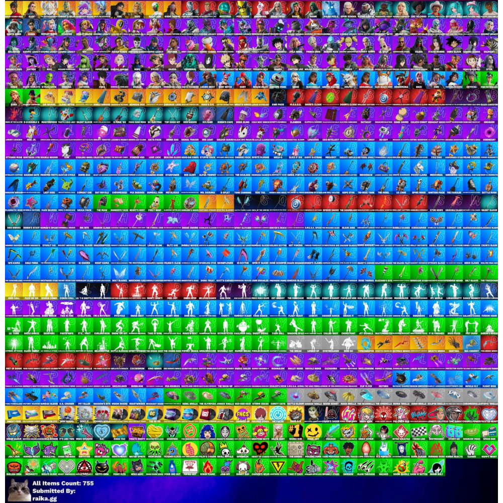 • В данном товаре часто попадаются редкие скины (Black Knight, Galaxy, Ikonik, Travis Scott и др.), большое количество скинов, кирок, танцев, дельтапланов, обёрток, В-Баксов, боевой пропуск и т.д.